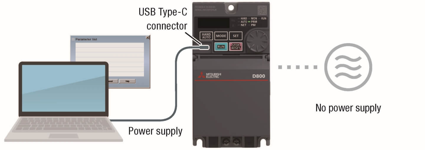 With a focus on user-friendliness, the FR-D800 VFDs feature a door-style surface cover and integrated wiring to make installation faster and easier. The FR-D800 is up to 37% smaller*1 than its equivalent predecessor, reducing enclosure size requirements, allowing for more flexible mounting, and reduced installation costs. A new USB Type-C interface lets users set parameters directly from a PC without powering up the VFD, streamlining both setup and maintenance.