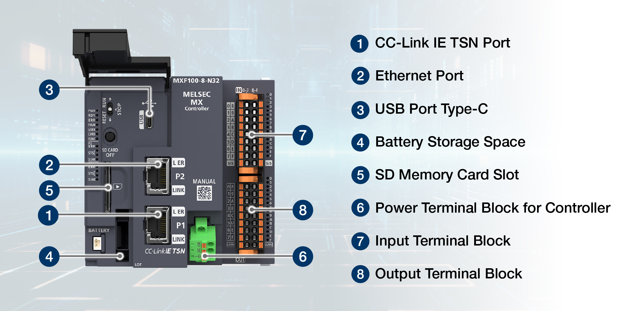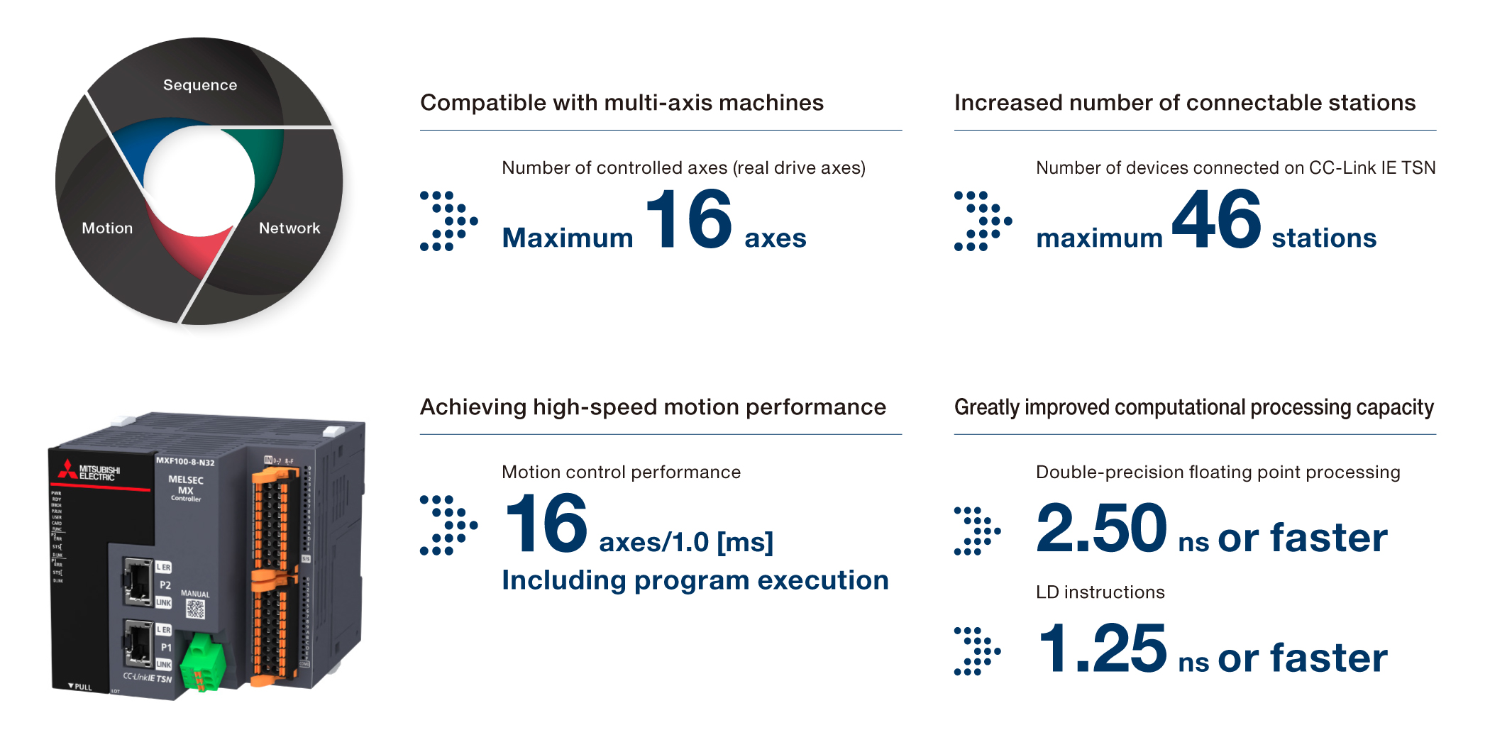 The MELSEC MX Controller integrates sequence, motion, and network control into a single platform, available in MX-R and MX-F models.