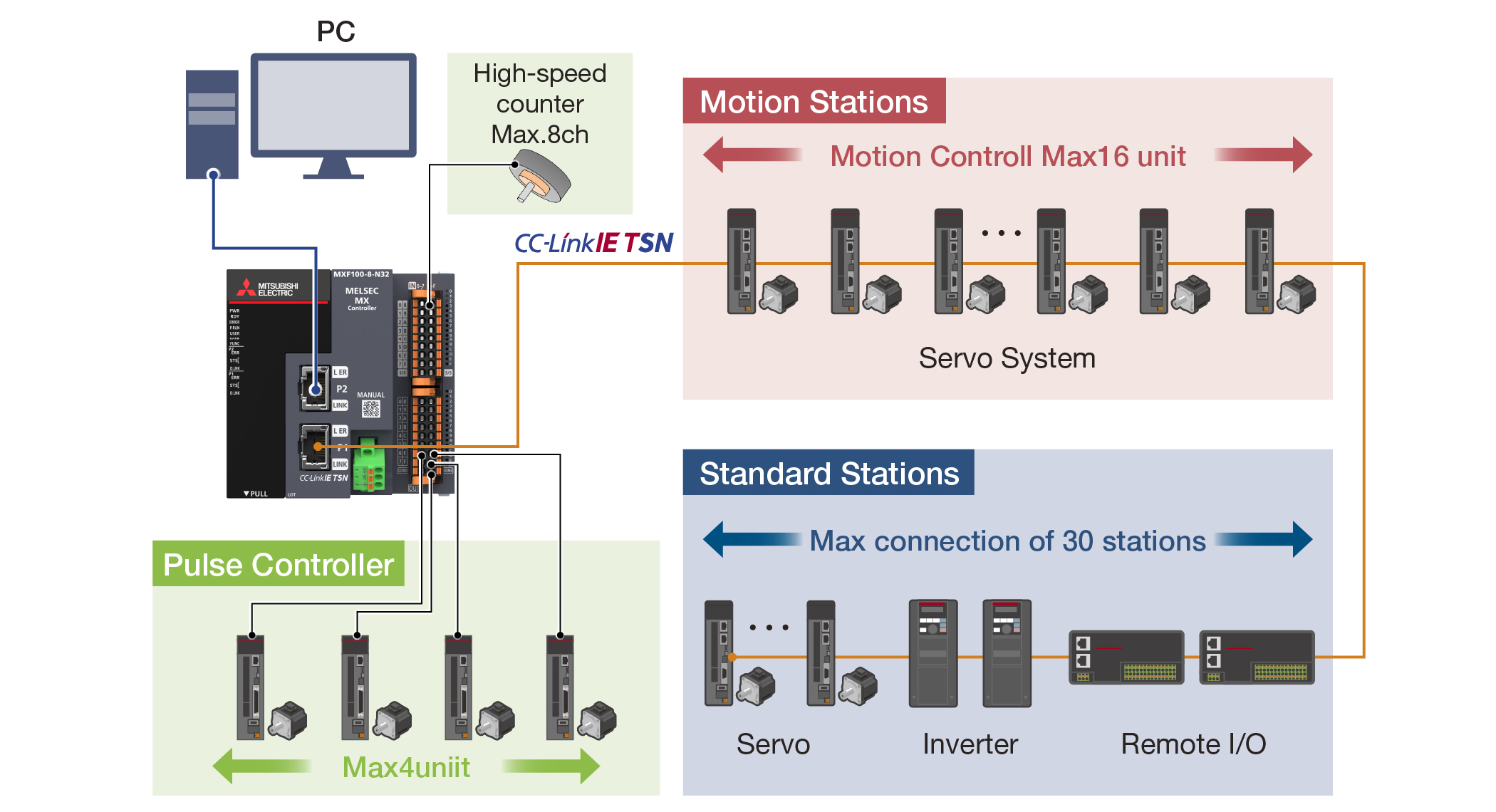 - Built-in CC-Link IE TSN enables control of up to 16 motion stations with synchronization as fast as 250μs.